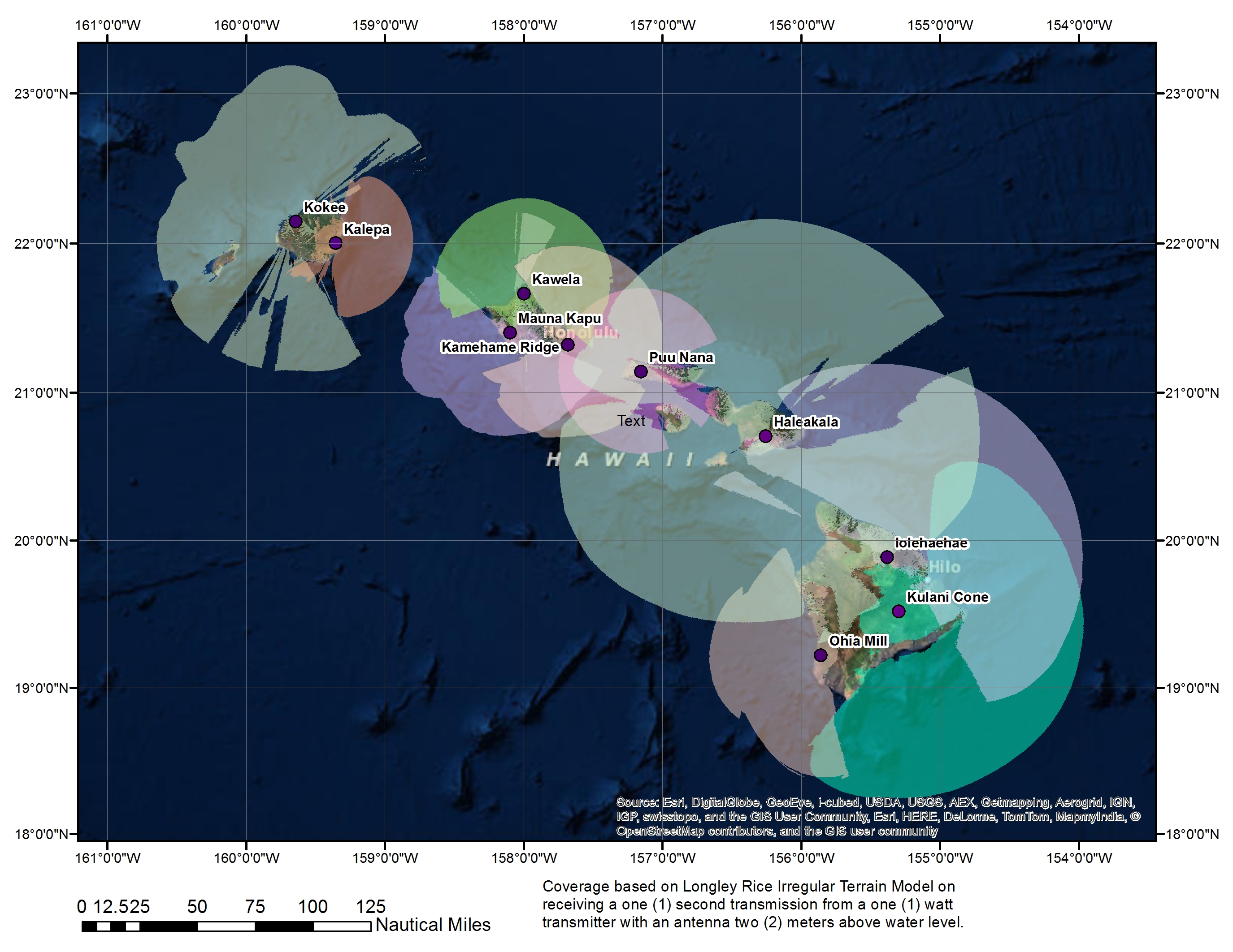 Predicted charts were created by C3CEN Remote Missions Systems Product Line using open source software RF Signal Propagation, Loss, and Terrain (RF SPLAT) analysis tool. The software calculates path loss based on the NTIA Longley-Rice Irregular Terrain Model (ITM) as well as the new Irregular Terrain with Obstructions Model (ITWOM v3.0). Terrain data was modeled based on the high resolution 1 arc-sec obtained from NASA’s Shuttle Radar Topography Mission (SRTM) flown in 2000. The coverage plots are displaying predicted regional coverage area based on line of sight between the Regional Fixed Facility VHF receive antenna and an antenna six feet above water level.