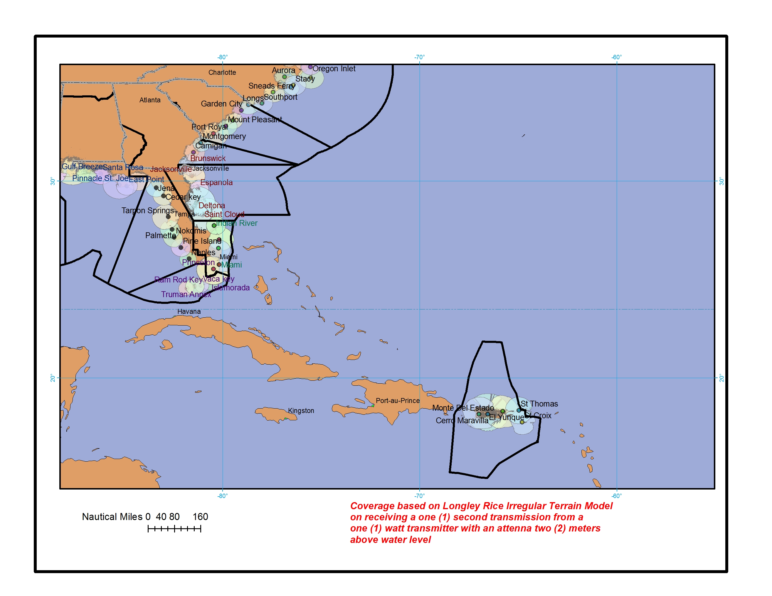 Predicted charts were created by C3CEN Remote Missions Systems Product Line using open source software RF Signal Propagation, Loss, and Terrain (RF SPLAT) analysis tool. The software calculates path loss based on the NTIA Longley-Rice Irregular Terrain Model (ITM) as well as the new Irregular Terrain with Obstructions Model (ITWOM v3.0). Terrain data was modeled based on the high resolution 1 arc-sec obtained from NASA’s Shuttle Radar Topography Mission (SRTM) flown in 2000. The coverage plots are displaying predicted regional coverage area based on line of sight between the Regional Fixed Facility VHF receive antenna and an antenna six feet above water level.